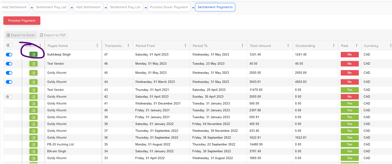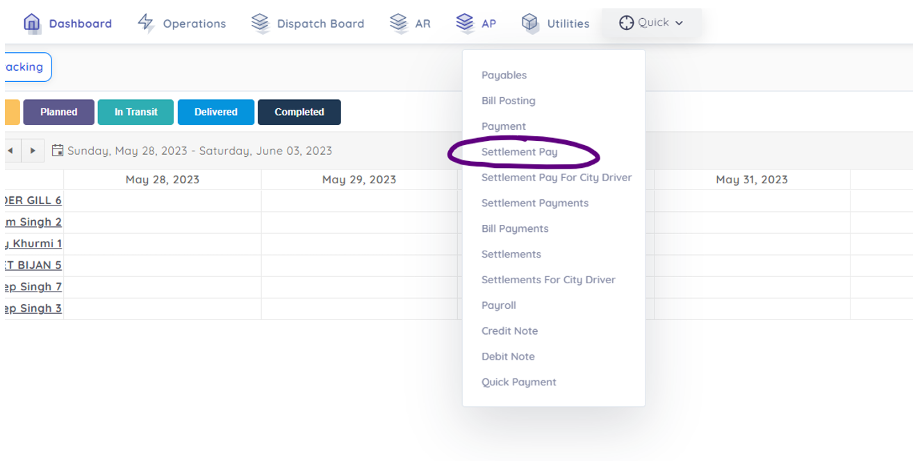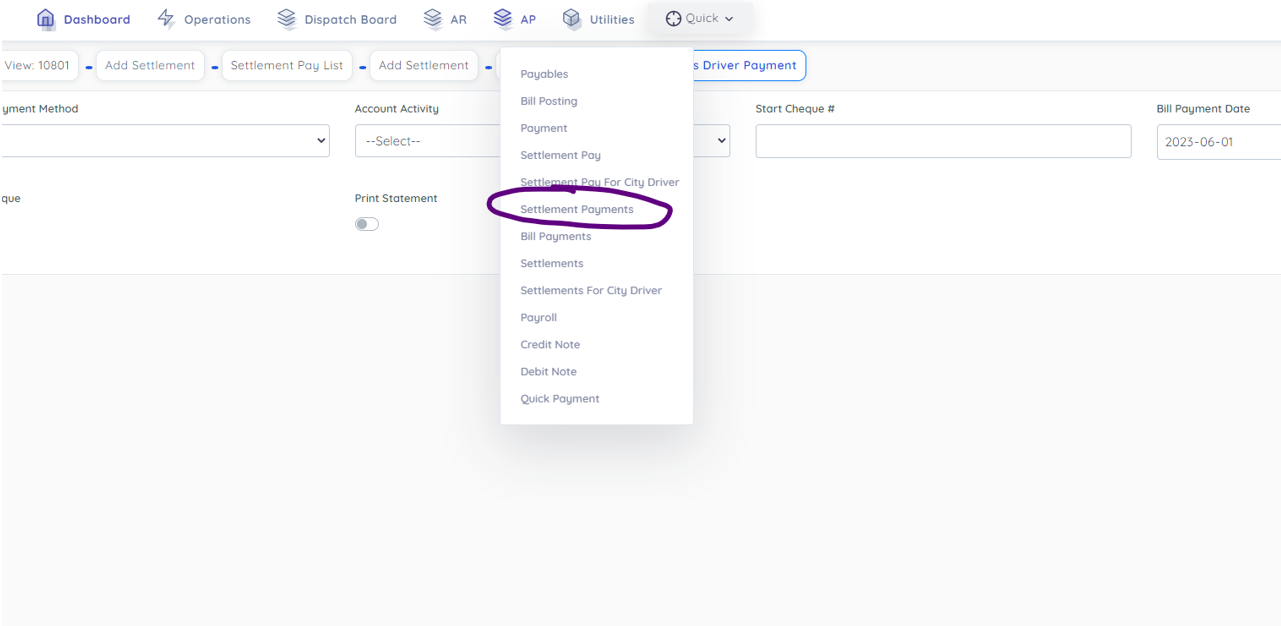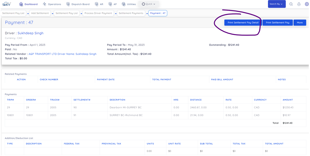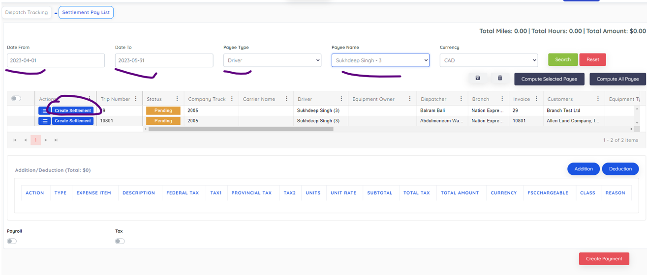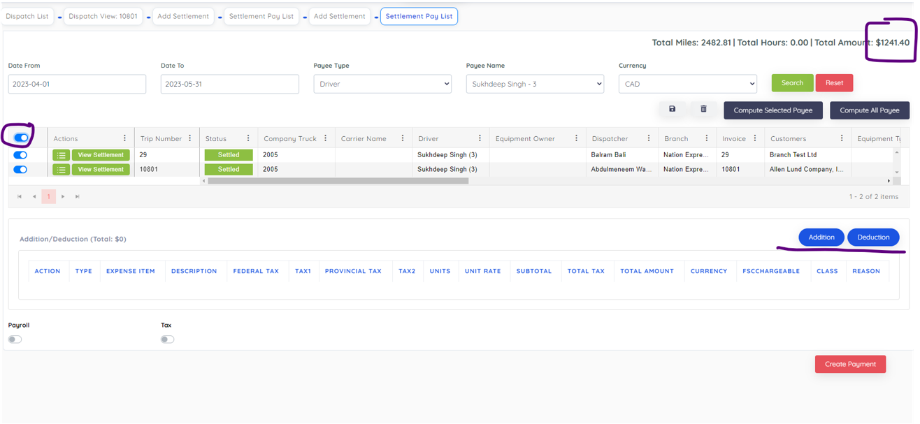 After creating settlement, you can select all loads and have option to addition or deductions. Then click create payment.