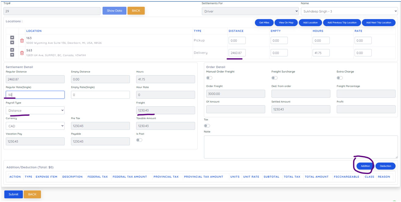 After Create Settlement it will show settlement according to price setting in his profile as below. Also you have option to add Empty move locations and addition or deduction you want to enter here.