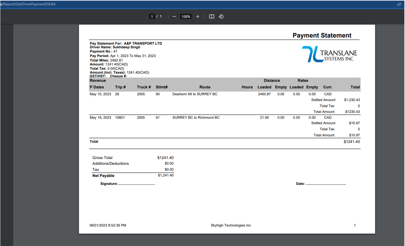 Select Pay Period and it will show all Trips made between these days by selected driver as below: