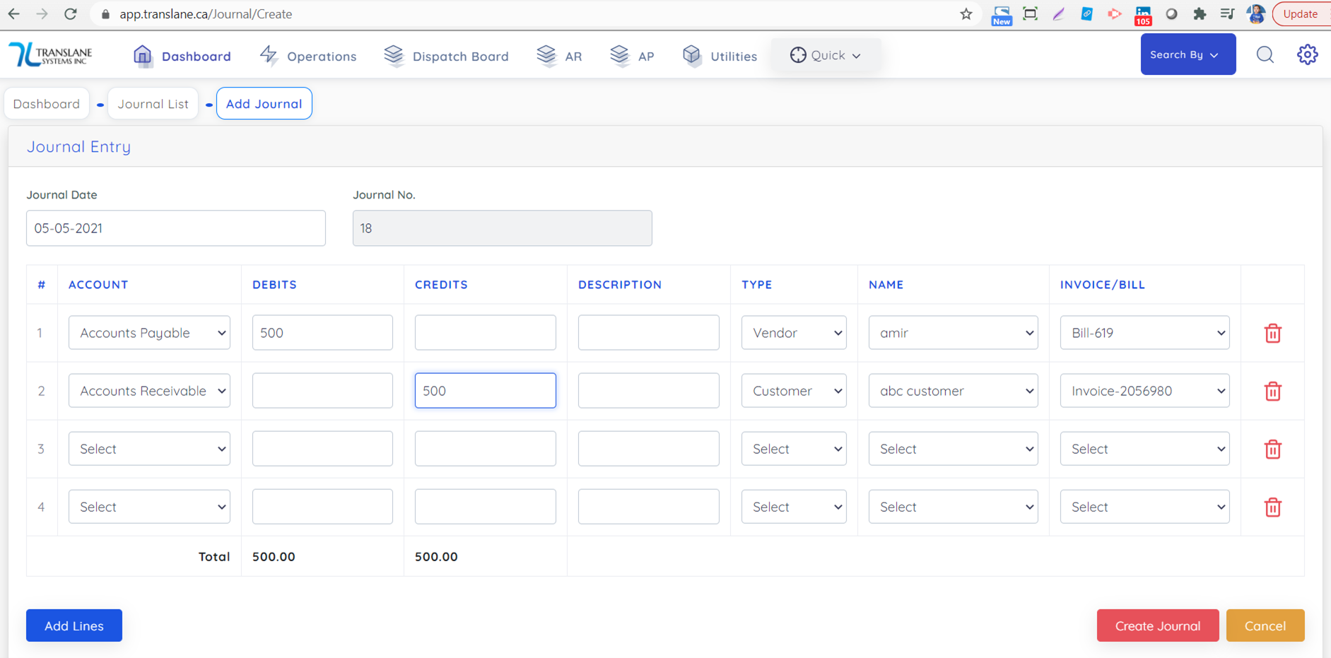 Journal Entry can be used for several purposes including entry for Opening balance, adjusting AR and AP invoices etc. Below is the screen to create entries: